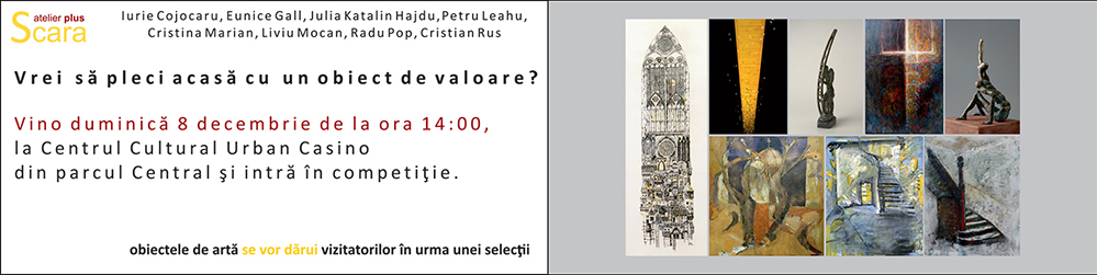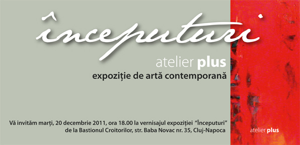 | Grupul Atelier Plus propune iubitorilor de arta clujeni un dialog vizual pe tema începuturilor, abordată din diverse perspective. Vă invită cu drag, marti 20 decembrie 2011 ora 18 la Bastionul Croitorilor unde va avea loc vernisajul expozitiei "Începuturi". ![]() Anca Mihaela Pustea · Andrei Marina · Cristina Marian · Csaba Enyedi · Eunice Danut · Iurie Cojocaru · Liviu Mocan Petru Leahu, Rares Balarau, Vlad Capusan vernisajul expoziţiei va avea loc în ziua de marţi, 20 decembrie 2011, la ora 18.00 la Turnul Croitorilor, Cluj Napoca, str. Baba Novac nr. 35. |